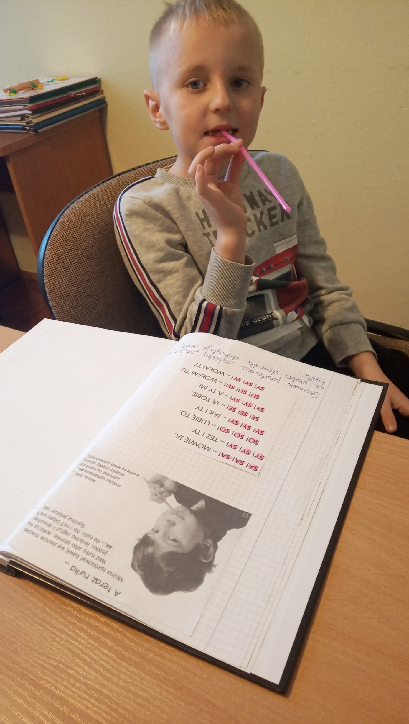 Po każdych zajęciach uczniowie otrzymują materiał do utrwalania w domu. Wszyscy mają założone zeszyty, gdzie wklejają wyjaśnione ćwiczenia oraz podawane są wskazówki do pracy z rodzicami.