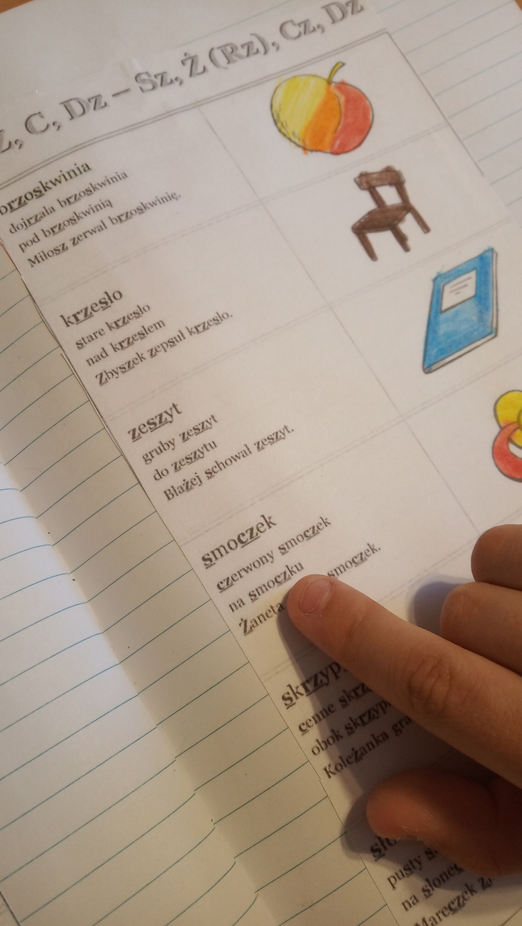Po każdych zajęciach uczniowie otrzymują materiał do utrwalania w domu. Wszyscy mają założone zeszyty, gdzie wklejają wyjaśnione ćwiczenia oraz podawane są wskazówki do pracy z rodzicami.