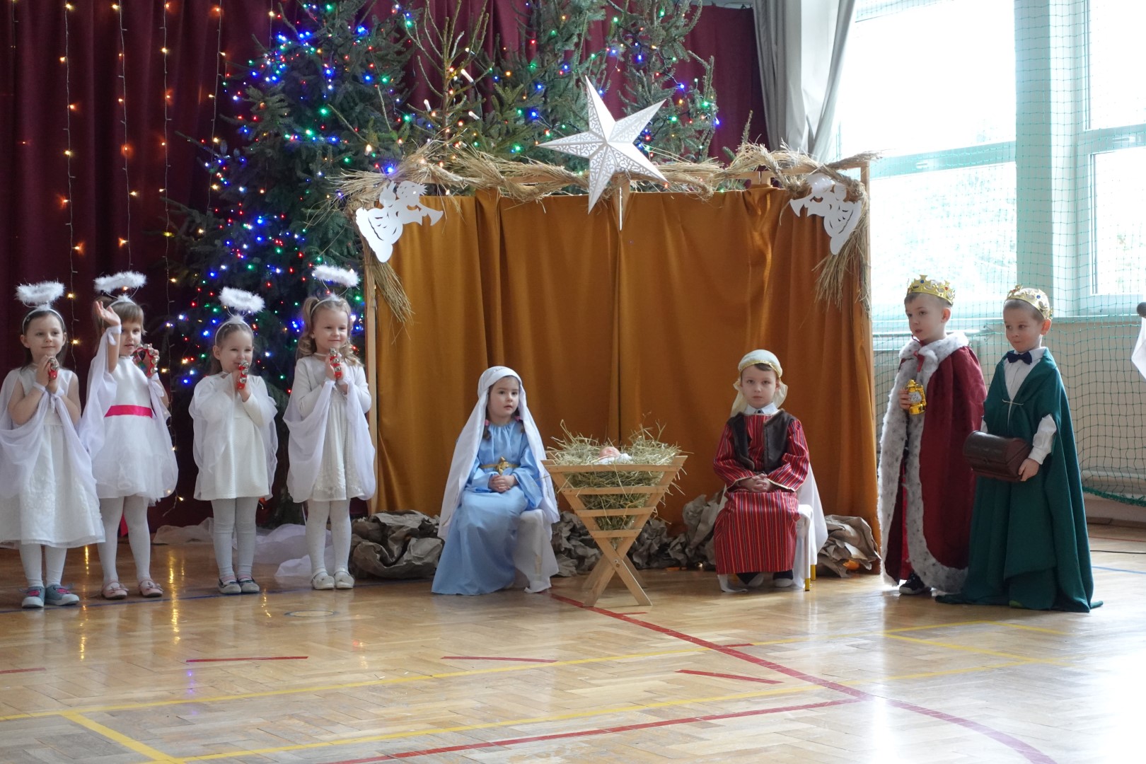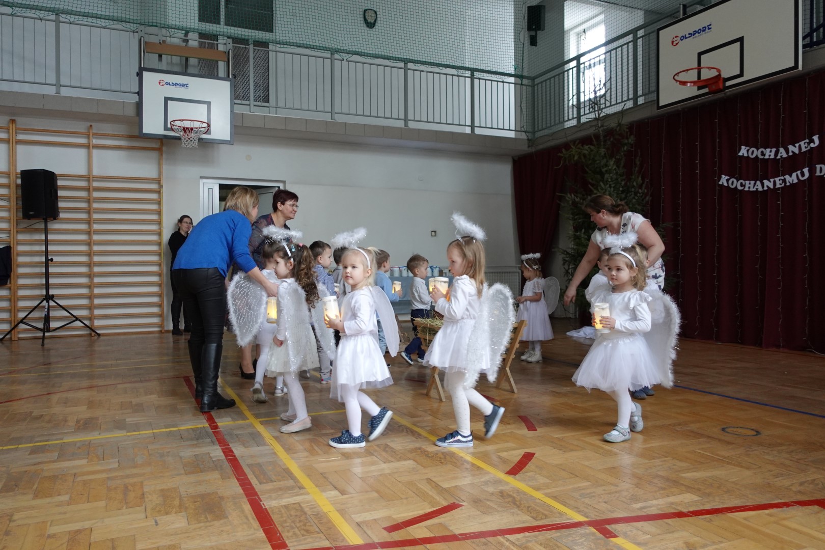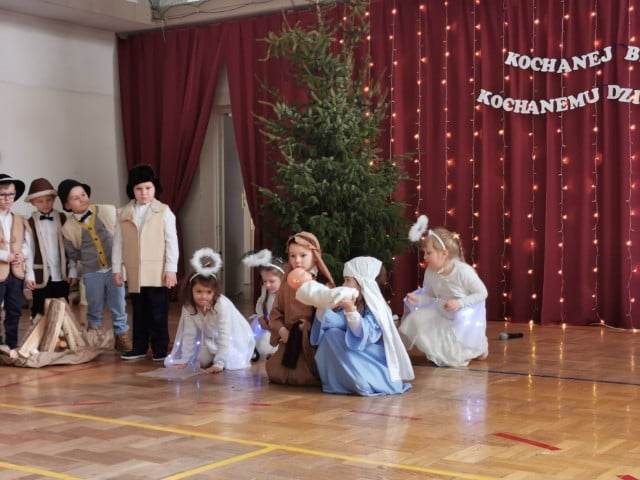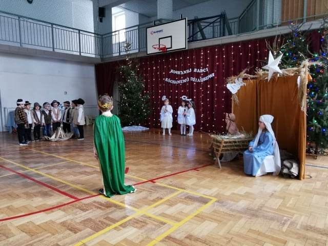 Takimi słowami rozpoczęło się przedstawienie jasełkowe, które z okazji "Dnia Babci i Dziadka" przygotowały przedszkolaki z grup Śmieszki i Wesołki .Przedstawienie odbyło się 30.01.2023r. na sali gimnastycznej w szkole podstawowej. Mali artyści z wielkim przejęciem i zaangażowaniem odgrywali swoje role: Józefa, Maryi, aniołków, królów, pasterzy i krakowiaków. Śpiewane przez dzieci kolędy i recytowane role przeniosły nas w czas Świąt Bożego Narodzenia, napełniły radością, ale też odrobiną zadumy. Babcie i dziadkowie byli bardzo dumni ze swoich wnucząt i nagrodzili ich występ dużymi brawami. Na koniec występu przedszkolaki złożyły życzenia swoim dziadkom i wręczyły własnoręcznie wykonane upominki. Rodzice przygotowali dla wszystkich pyszny poczęstunek. Było ciasto, ciasteczka, kawa i herbata.