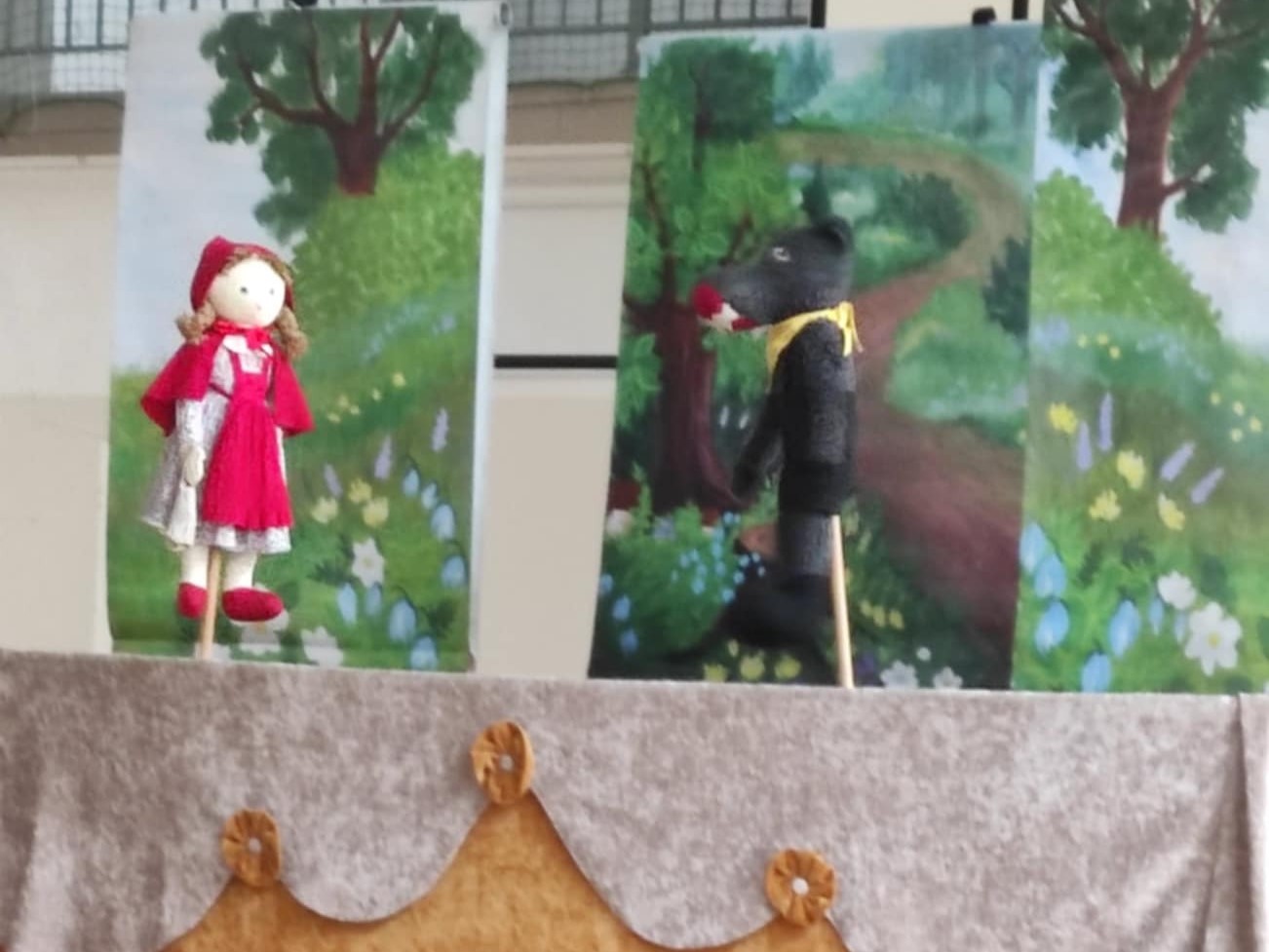 Spektakl kukiełkowy w wykonaniu aktorów teatru " Bajka" oglądały wszystkie dzieci z naszego przedszkola. W odsłonie trzech krótkich bajeczek: "Wilk i koźlątka", "Czerwony Kapturek" oraz "Na ruchliwej ulicy" dzieci otrzymały dużą dawkę cennych rad. Celem spektaklu było ukazanie jak unikać zagrożeń na ulicy, czyli dlaczego należy przestrzegać zasad ruchu drogowego oraz gdzie szukać pomocy, jeśli brak obok rodziców lub opiekunów. Ukazał również, aby nie ufać obcym, nie nawiązywać z nimi znajomości, nie przyjmować od nich prezentów.