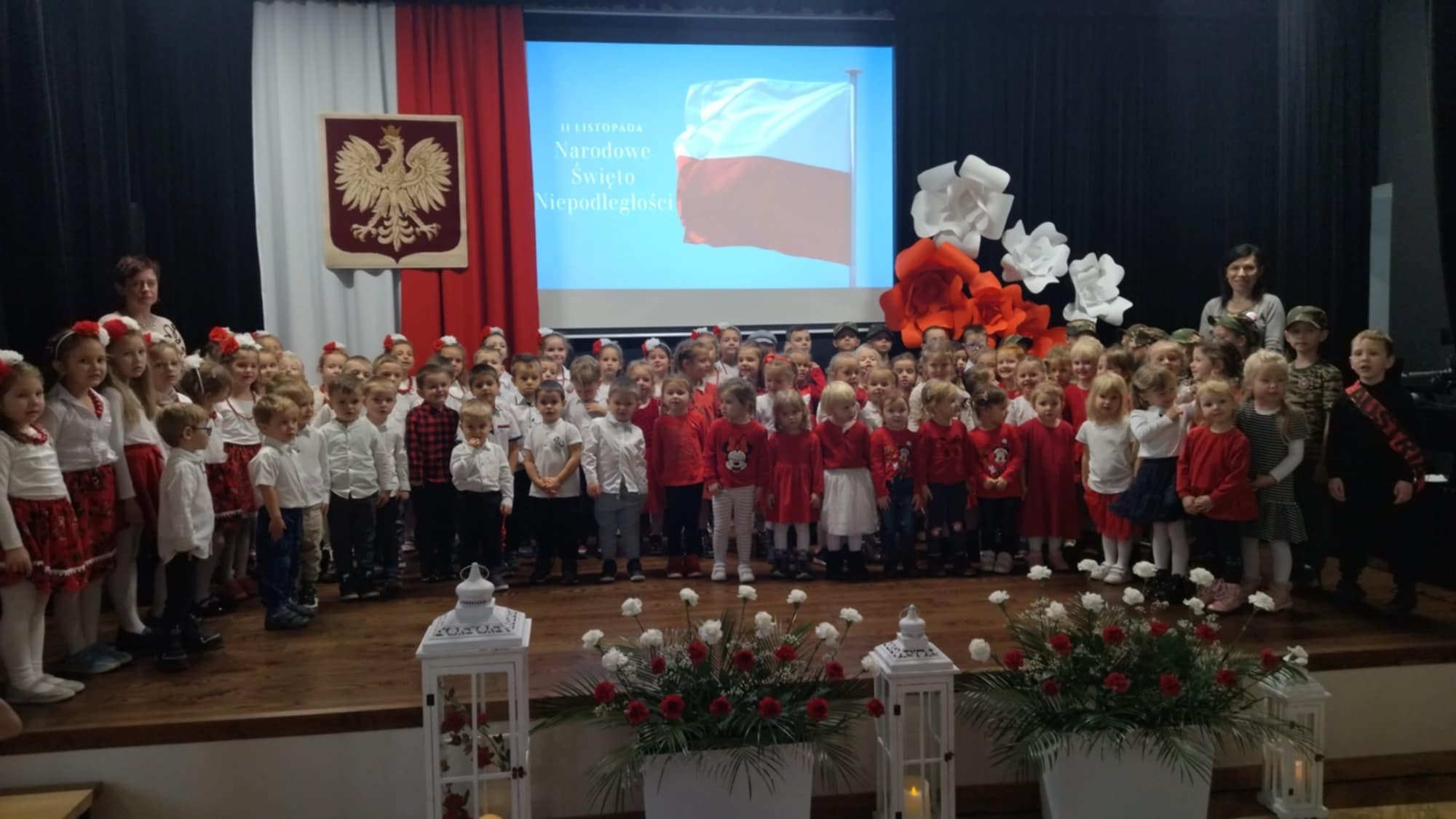 Dnia 8 listopada w naszym przedszkolu świętowaliśmy Narodowe Święto Niepodległości. To wyjątkowy czas dla każdej Polki i Polaka. Z tej okazji dzieci z wszystkich grup oraz pracownicy przedszkola zebrali się w sali widowiskowej Domu Młodzieży im. abpa. L. Wałęgi, aby uroczyście świętować ten wyjątkowy dla Polaków czas. Wszyscy z powagą i w dużym skupieniu oglądali program artystyczny przygotowany przez dzieci ze starszych grup przedszkolnych. W ramach akcji „Szkoła do hymnu” wspólnie odśpiewaliśmy Mazurka Dąbrowskiego i powróciliśmy do przedszkola trzymając biało-czerwone flagi. Dzieci z młodszych grup przedszkolnych w ramach projektu „Postaw na Wartości” przedstawiły flagę naszego kraju w kreatywny sposób, a mianowicie układając swoje ciała w kolor biało-czerwony.