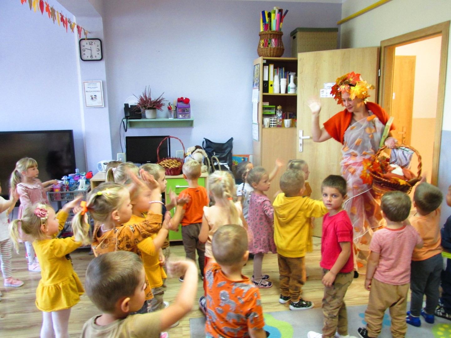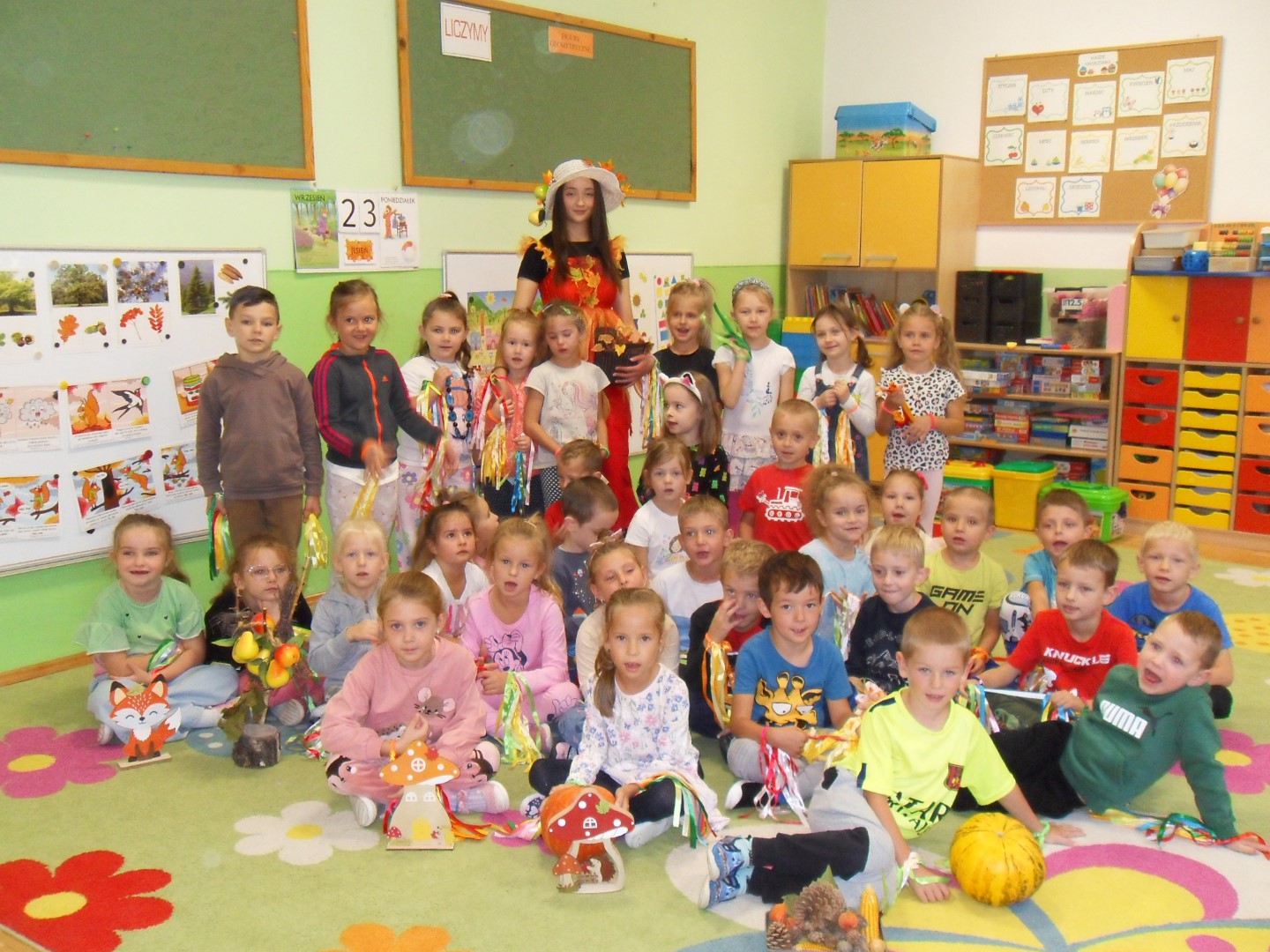 Wrzesień to czas uroczystego powitania nowej pory roku - jesieni. Przedszkolaki skrupulatnie przygotowały się do tej uroczystości- obserwowały pogodę za oknem, zmiany zachodzące w przyrodzie, zbierały kasztany, oglądały zdjęcia jesiennych krajobrazów, owoców jesieni. W końcu do nas przyszła – piękna, w kolorowej sukni, kapeluszu na głowie i koszyku w ręce. Grupa Jagódki widziała Panią Jesień podczas wyjścia do lasu, przemykającą pomiędzy drzewami, natomiast pozostałe grupy miały okazję zobaczyć ją w przedszkolu, zatańczyć z nią jesienny taniec i poznając dary jesieni jakie miała w swoim koszu.