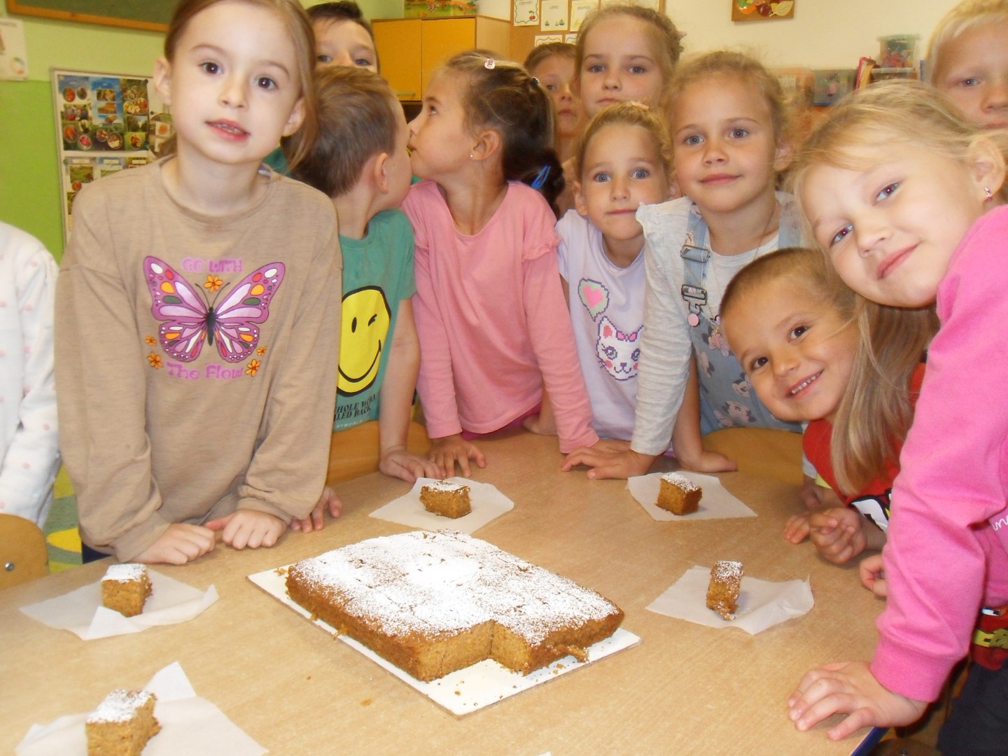 W dniu 10 października dzieci z grupy Wesołki podczas zajęć piekły ciasto marchewkowe. Przedszkolaki poznały przepis, sprawdziły czy mają wszystkie składniki, następnie dodawały składniki do miski według instrukcji i mieszały ciasto mikserem. Przedszkolaki były bardzo zadowolone, że wykonały ciasto samodzielnie. Przy okazji okazało się, że marchewka może być wspaniałym składnikiem ciasta. Na końcu dzieci ze smakiem zjadały wypiek.