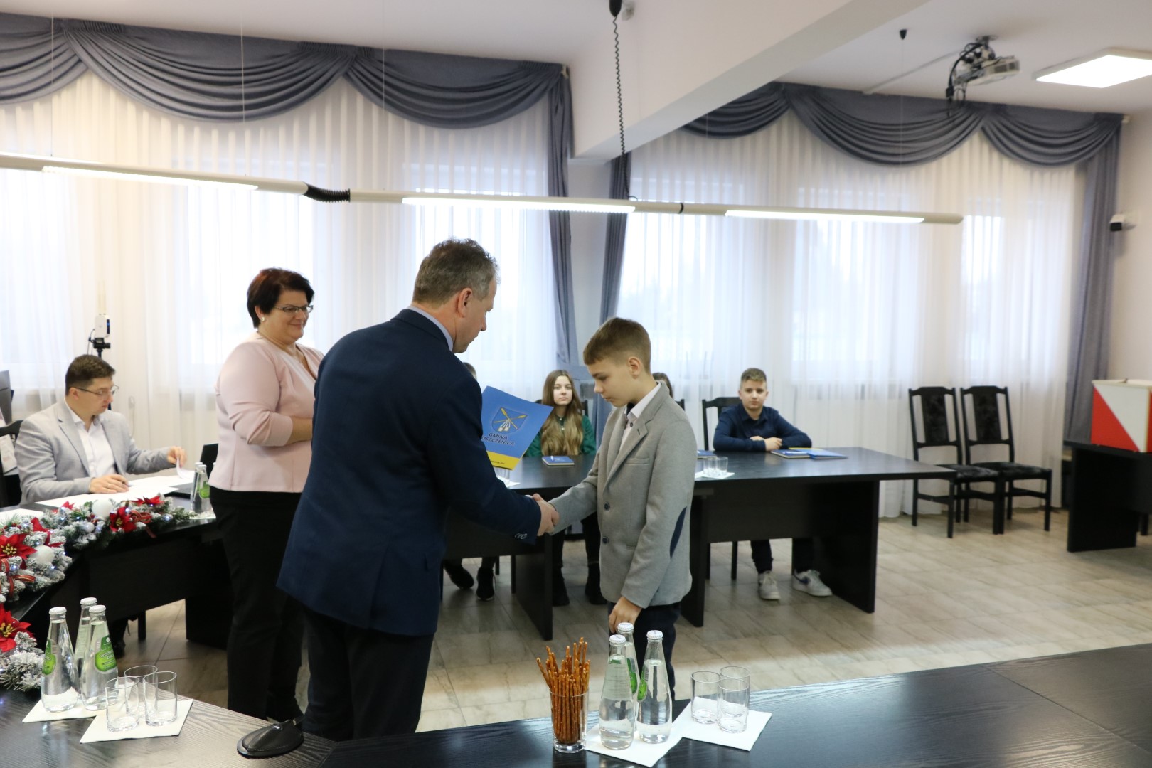 Na zakończenie sesji Pan Wójt i Kamil Jędrzejowski podziękowali uroczyście Dyrektorowi Zespołu Szkół w Moszczenicy Panu Witoldowi Bogdanowi za jego wkład pracy i dziesięcioletnią opiekę nad Młodzieżową Radą Gminy I-V kadencji.