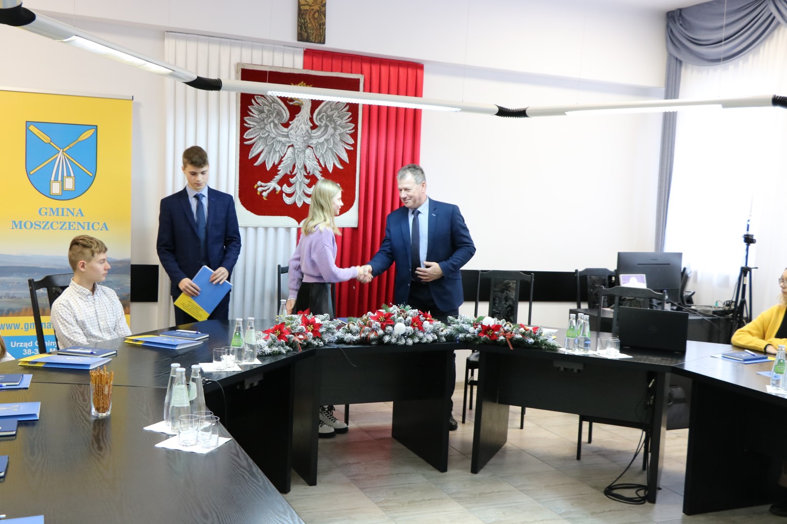 Podczas sesji radni odebrali zaświadczenia z rąk Wójta Gminy Moszczenica i Przewodniczącej Rady Gminy. Następnie złożyli ślubowanie. Pan Wójt Jerzy Wałęga w swoim wystąpieniu przypomniał zebranym historię powstania Młodzieżowej Rady Gminy Moszczenica oraz funkcje i zadania jakie pełni w społeczności lokalnej.