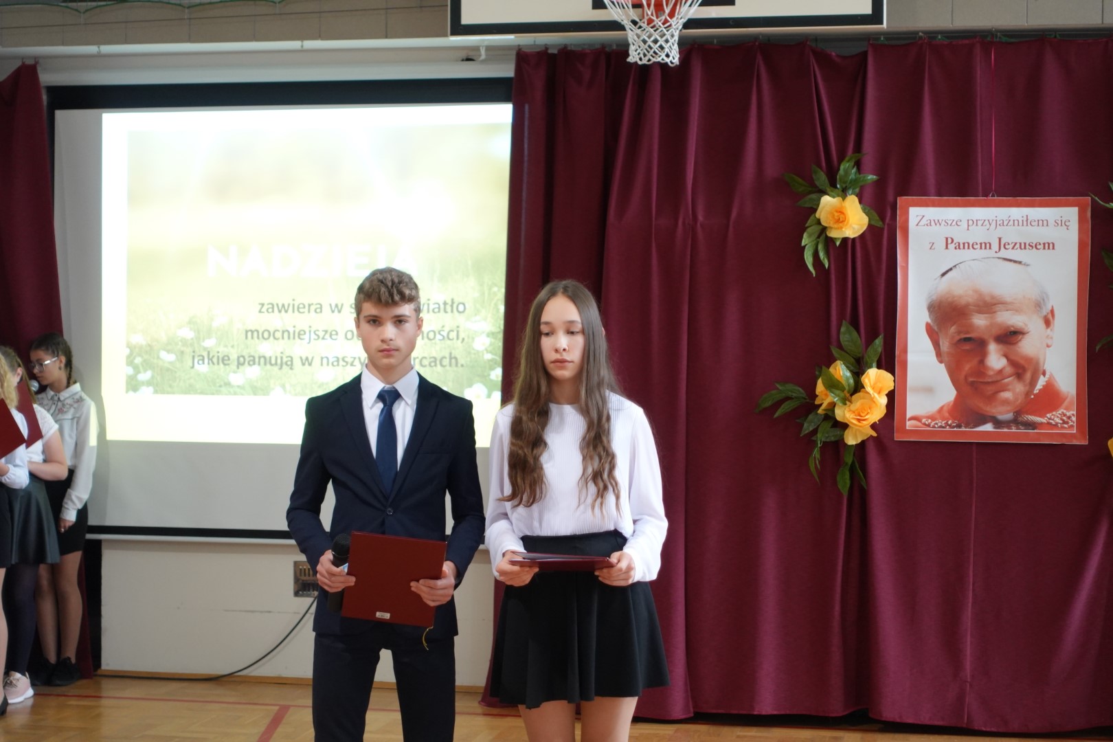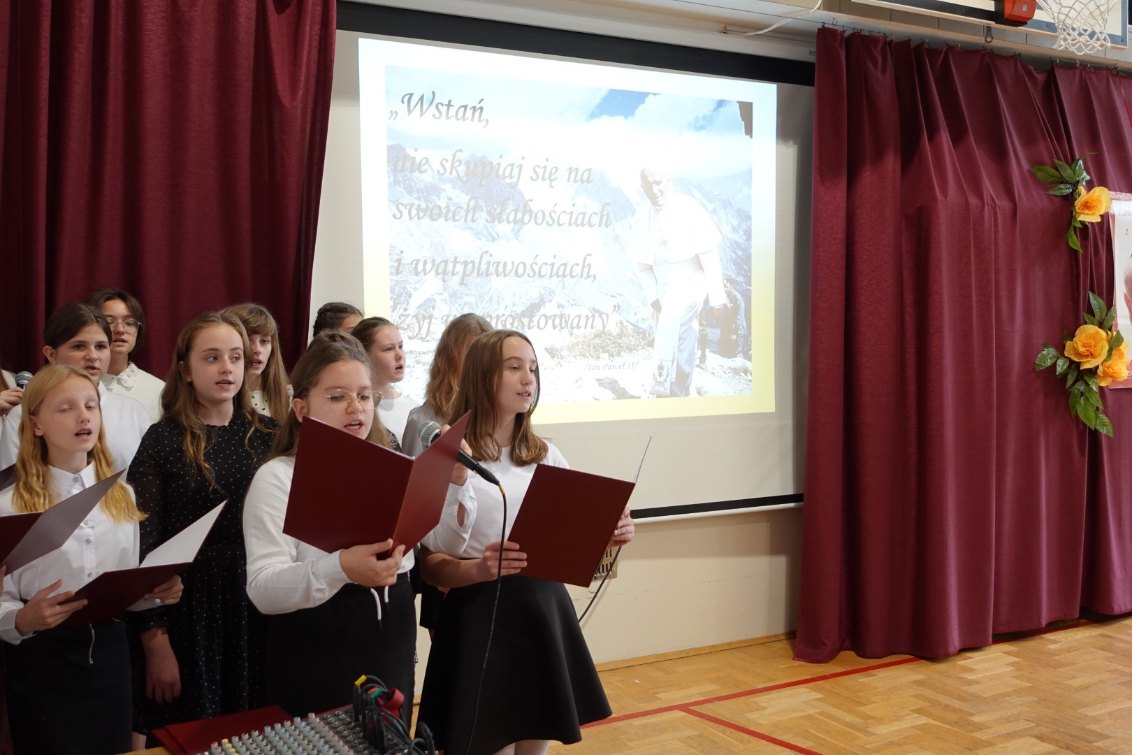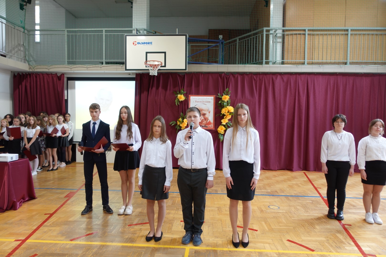 Dnia 19 października odbyła się w naszej szkole uroczysta akademia z okazji Dnia Papieskiego. Mottem uroczystości stały się słowa ,,Ocalić od zapomnienia’’. Uroczystość przygotowali uczniowie klas VIII pod opieką p. Anny Potok oraz p. Jadwigi Gryga. Uroczystość uświetniły piosenki śpiewane przez szkolny chór pod kierunkiem p. Mirosława Potoka.