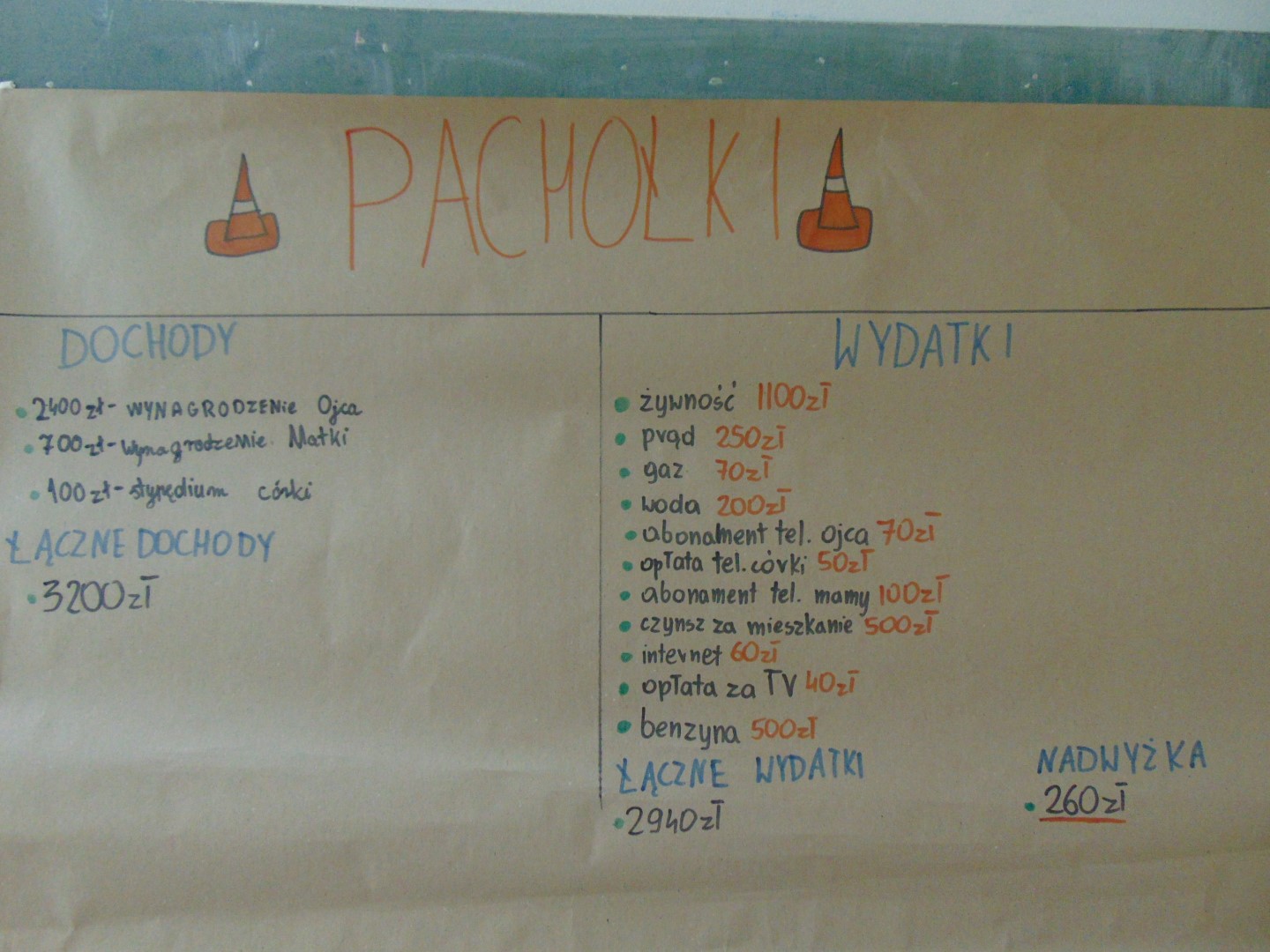 Tym razem na zajęciach w ramach projektu Rozwoju Kompetencji Kluczowych tworzyliśmy budżety naszych rodzin. Najpierw poznawaliśmy podstawowe zasady gospodarowania rodzinnymi środkami. Zastanawialiśmy się skąd się biorą pieniądze w rodzinie, jakie mogą być źródła dochodów. Później analizowaliśmy jakie mogą być wydatki w rodzinie. Na przykładowym budżecie rodziny próbowaliśmy zastanawiać się w grupach naszych nowych rodzin jak zrównoważyć ten budżet by nie był deficytowy, co możemy zrobić, by uzyskać w nim oszczędności. Każda rodzina wymyśliła swoje nowe nazwisko. Dokonała podziału ról w rodzinie i każda osoba brała udział w konstrukcji miesięcznego budżetu. Po dokonaniu zmian w budżecie został on przeniesiony na plansze i zaprezentowany innym rodzinom. Może po tych zajęciach bardziej zrozumiemy, dlaczego nie zawsze nasze potrzeby w rodzinach są w pełni zaspokojone.