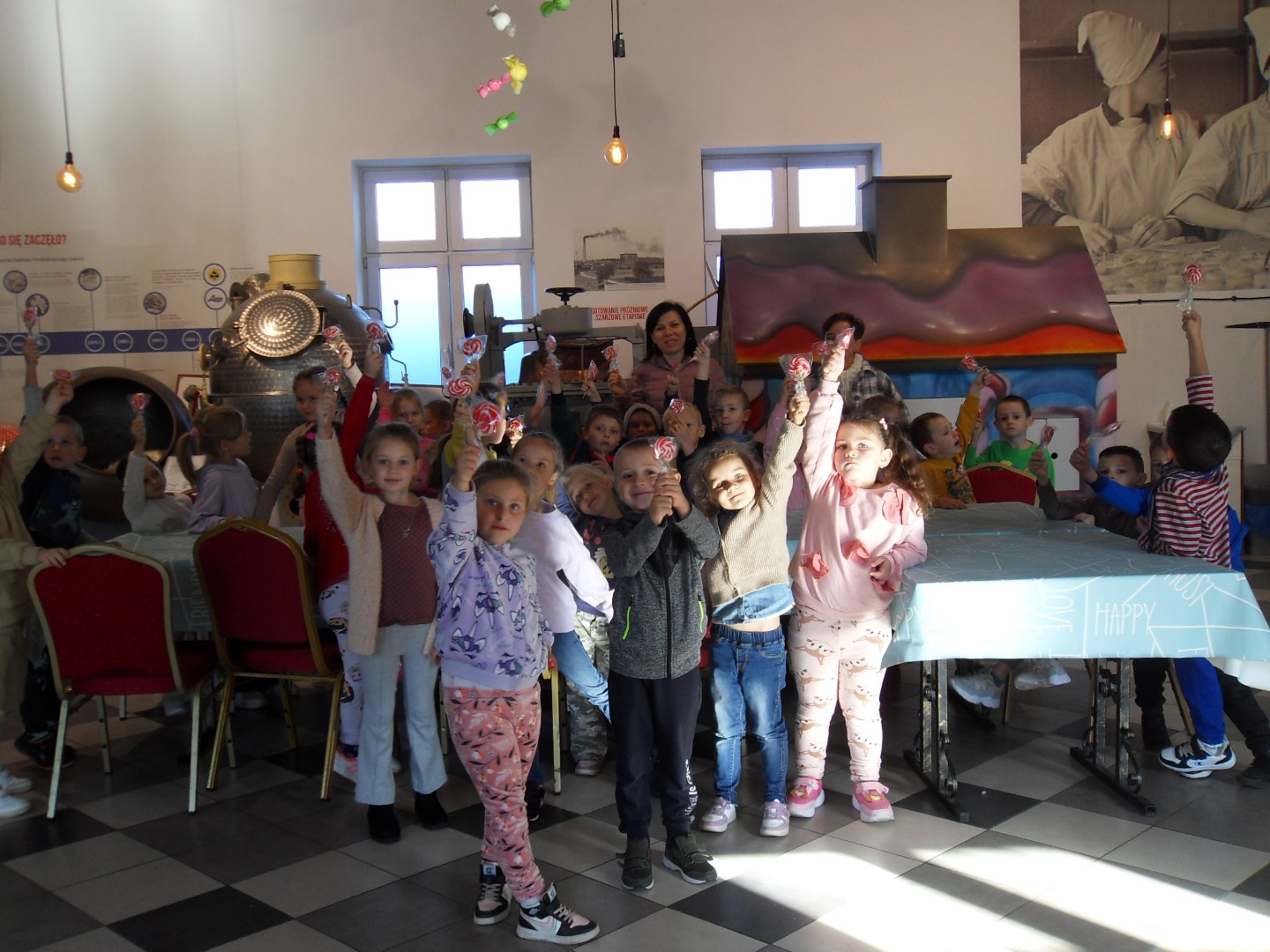 18 października 2024 roku dzieci z grup: Skrzaty i Wesołki wybrały się na wycieczkę do Muzeum Lizaka w Jaśle. Zwiedzanie muzeum zaczęliśmy od sklepiku ze słodkościami, gdzie dzieci mogły oglądać różne kolorowe lizaki. Pani przewodnik w ciekawy sposób opowiedziała o początkach powstawania lizaków oraz jak wyglądała ich produkcja na przestrzeni lat. Zapoznaliśmy się z zawodem cukiernika i karmelarza. Poznaliśmy również proces tworzenia karmelu, barwienia, łączenia w różne kolory. Największą atrakcją dla wszystkich przedszkolaków była możliwość własnoręcznego zrobienia lizaka z przygotowanej masy. W muzeum mogliśmy również posmakować cukrów, z których produkuje się lizaki i powąchać aromatów dodawanych do karmelu, aby nadać mu różne smaki. Potem udaliśmy się na warsztaty robienia pizzy, gdzie bliżej poznaliśmy zawód kucharza. Po wysłuchaniu krótkiej historii o włoskiej pizzy i po dokładnym umyciu rąk każdy otrzymał porcję swojego ciasta i po rozwałkowaniu mógł przyozdobić swoje ciasto sosem pomidorowym, szynką, salami, kukurydzą i serem według własnych pomysłów i smaków. Następnie wszystkie pizze zostały upieczone, a na koniec każdy z apetytem zjadł swoją. Dzieci pełne wrażeń i z uśmiechem na twarzy wróciły do przedszkola.