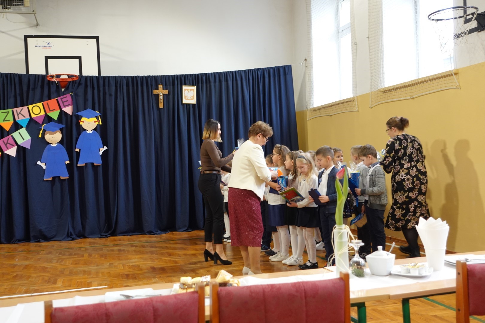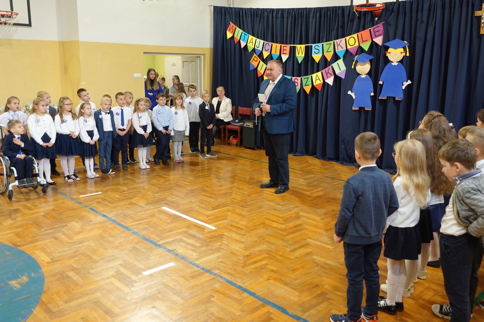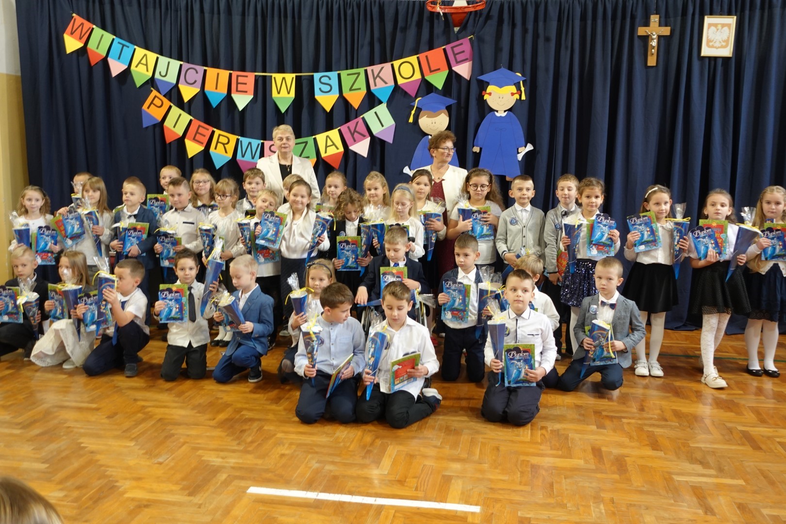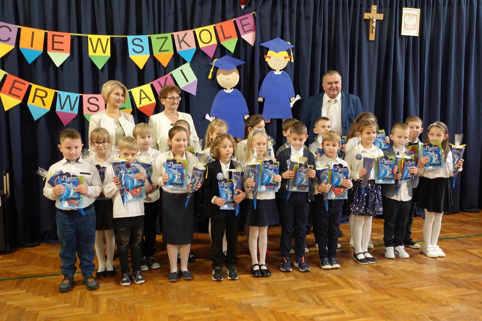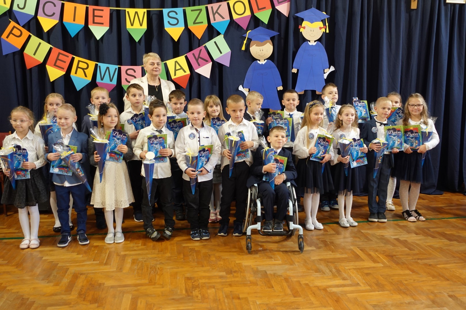 Dzień 8 listopada 2023r zapadł głęboko w pamięci pierwszoklasistów i ich rodziców. W tym bowiem dniu odbyło się Pasowanie na ucznia i czytelnika. Na uroczystość licznie przybyli zaproszeni goście. Występ uświetniła część artystyczna którą przedstawiły pierwszaki pod kierunkiem wychowawczyń; p. Janiny Szczerby i p. Krystyny Tarsa, a do której przygotowywały się od pierwszych dni pobytu w szkole. Dzieci zaprezentowały montaż słowno-muzyczny; śpiewały piosenki, recytowały wiersze o różnej tematyce, rozwiązywały zagadki. Nie zabrakło również zadań matematycznych. Pierwszaki spisały się na medal. Kulminacyjnym punktem całej uroczystości był akt Pasowania na ucznia i czytelnika. Każde dziecko otrzymało dyplom, plakietkę i książeczkę oraz słodki dodatek. Na zakończenie rodzice przygotowali słodki poczęstunek.