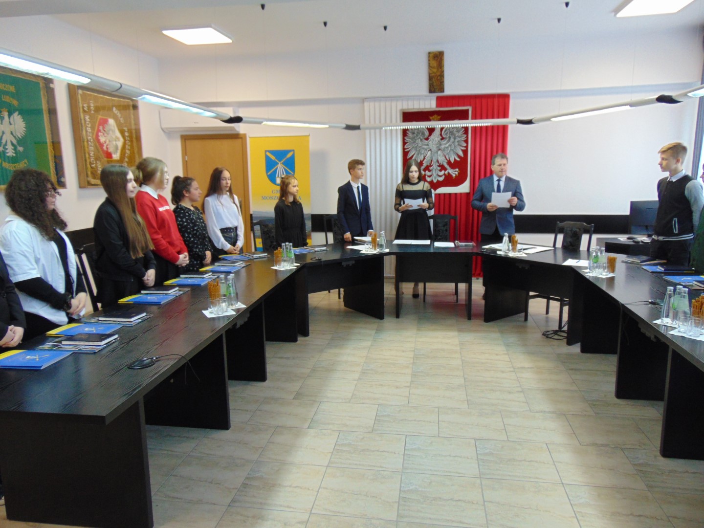 Sesję prowadziła na początku Przewodnicząca MRG czwartej kadencji Anna Kudłaty. Obecni byli zaproszeni goście: Wójt Gminy Jerzy Wałęga, Sekretarz Gminy Teresa Brągiel, Skarbnik Jolanta Bielewicz, Przewodnicząca Rady Gminy Izabela Wąsowska, Wicedyrektor Zespołu Szkół w Staszkówce Iwona Cygnarowicz, opiekun MRG – Dyrektor Zespołu Szkół w Moszczenicy Witold Bogdan oraz grupa uczniów z ZS Staszkówka – uczestników projektu obywatelskiego. Po czynnościach proceduralnych Przewodnicząca Gminnej Komisji Wyborczej – Gabriela Bajorek - odczytała Protokół z przebiegu wyborów. Następnie Pan Wójt i Pani Przewodnicząca Rady wręczyli zaświadczenia o wyborze na Radnych. Szczególnym przeżyciem dla nowych radnych było uroczyste złożenie ślubowania. Pan Wójt odczytał test ślubowania, a następnie pojedynczo wywoływani Radni wypowiadali z przejęciem: „ślubuję!”.