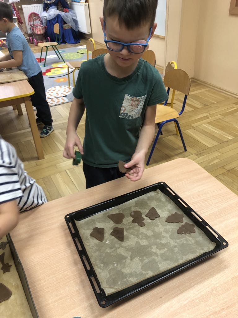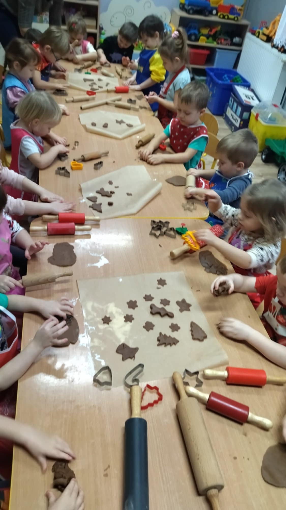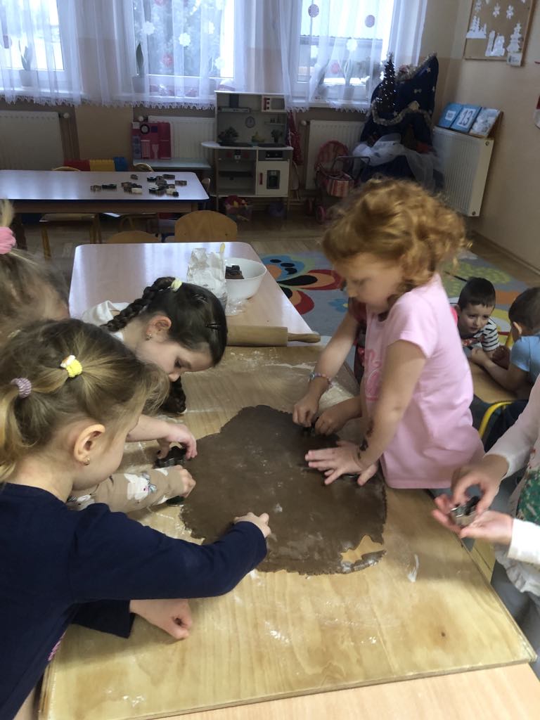 Zgodnie z przedświąteczną tradycją przedszkolaki upiekły pyszne świąteczne pierniczki. Z pomocą pań praca z przygotowaniem wypieków szła sprawnie i bez trudu. Dzieci wałkowały ciasto i wykrawały świąteczne kształty – choinki, gwiazdki, bałwanki, bombki, aniołki. Następnie słodkie ciasteczka piekły się w przedszkolnej kuchni. Po przedszkolu zaczął unosić się wspaniały zapach pieczonych pierniczków, który wprawił wszystkich w świąteczny nastrój.