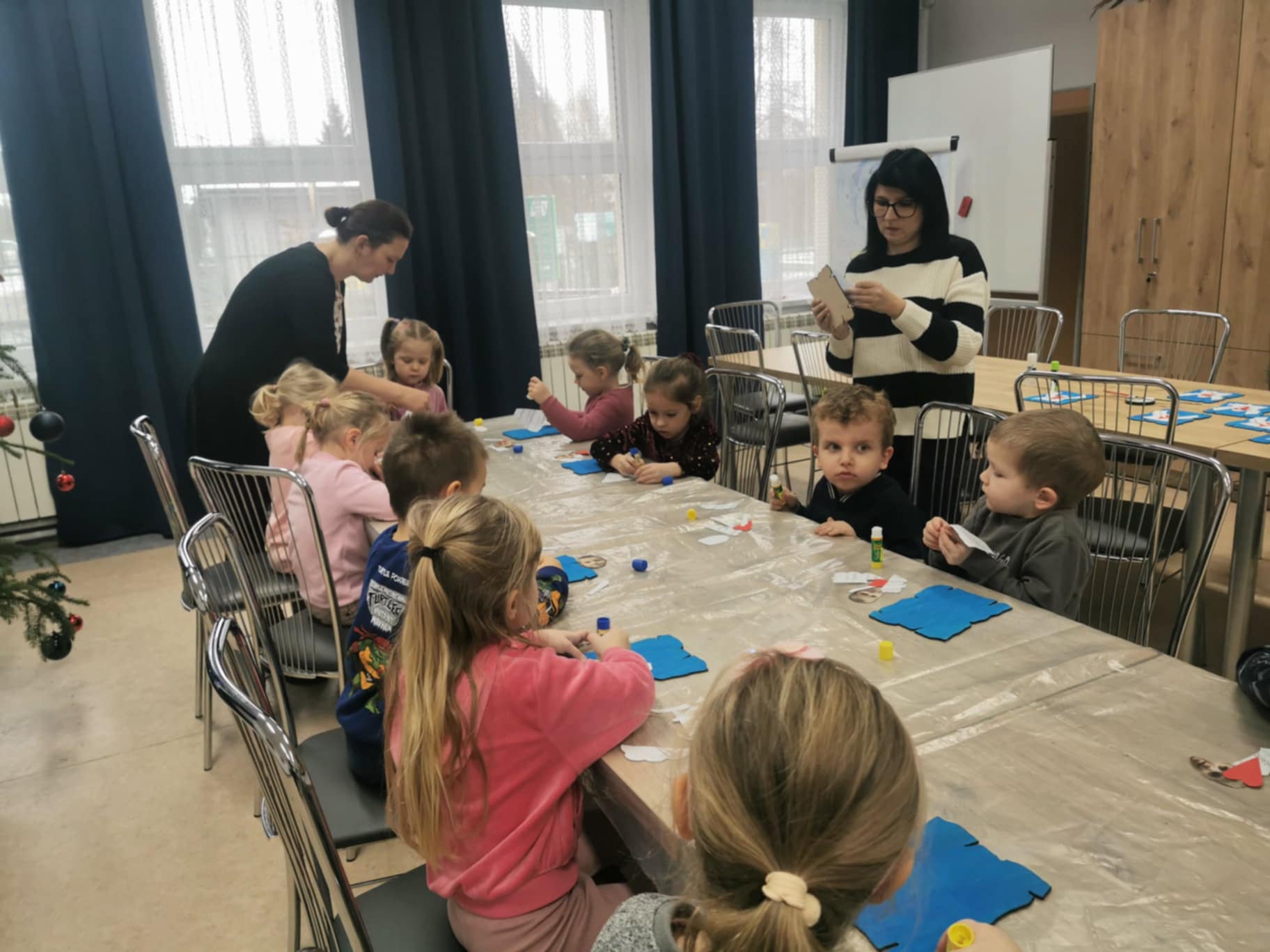 Dnia 12 grudnia przedszkolaki z grup Muchomorki i Leśne Ludki odwiedziły Ośrodek Kultury i Biblioteki w Moszczenicy, aby uczestniczyć w świątecznych warsztatach plastycznych. Dzieci wykonywały dla swoich najbliższych świąteczne upominki. Po zajęciach udały się zwiedzić Pracownię Świętego Mikołaja, gdzie wysłuchały książeczki „Franklin i Boże Narodzenie” czytanej przez Panią Halinkę. Czas szybko minął. Wszyscy bawiliśmy się wyśmienicie.