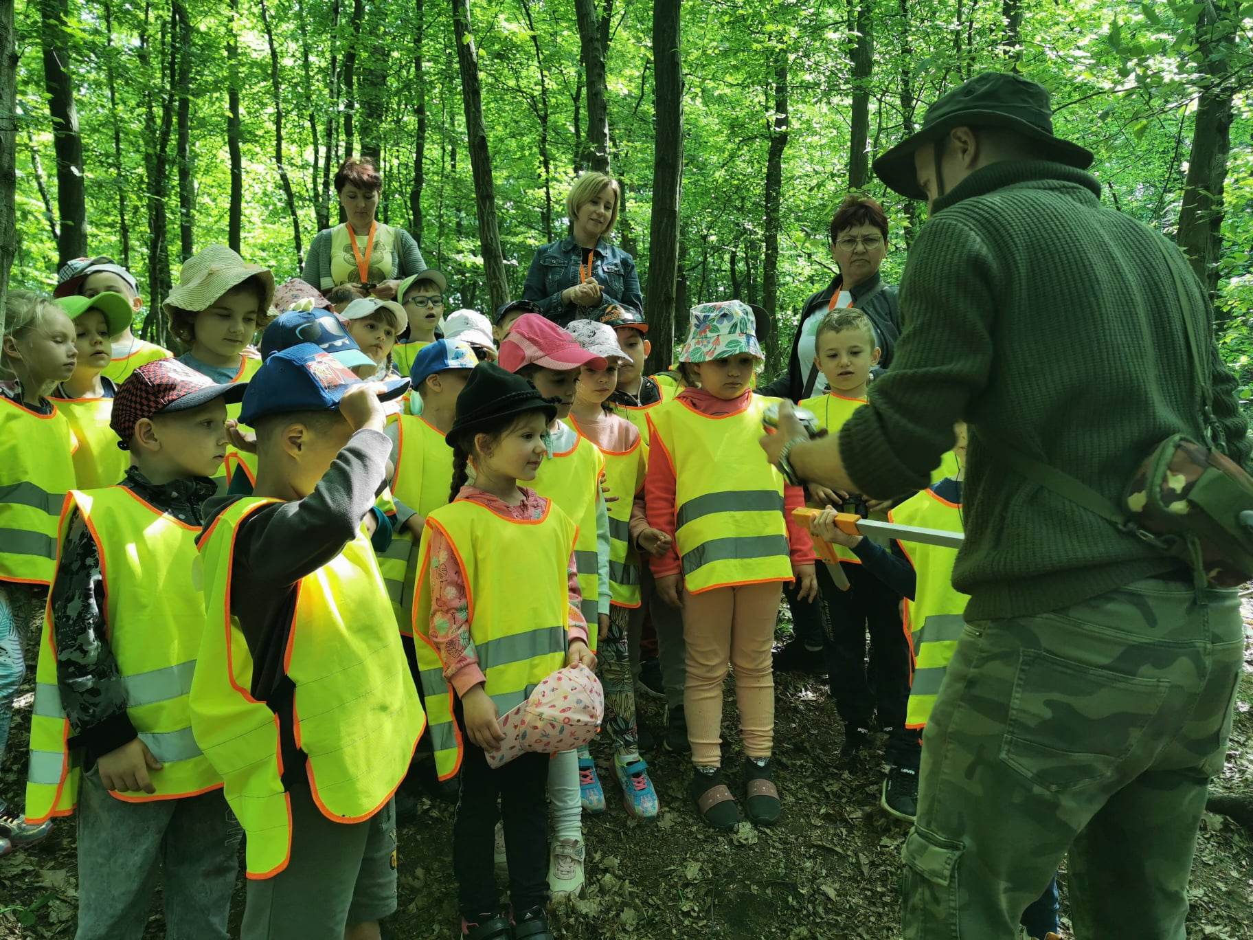 przygotował dla dzieci mnóstwo atrakcji. Przedstawił też jak wygląda poroże zwierząt mieszkających w lesie. Następnie pokazał grzyby, które występują w lesie. Dzieci poznały ich nazw oraz dowiedziały się, które są dla człowieka trujące, a które jadalne.